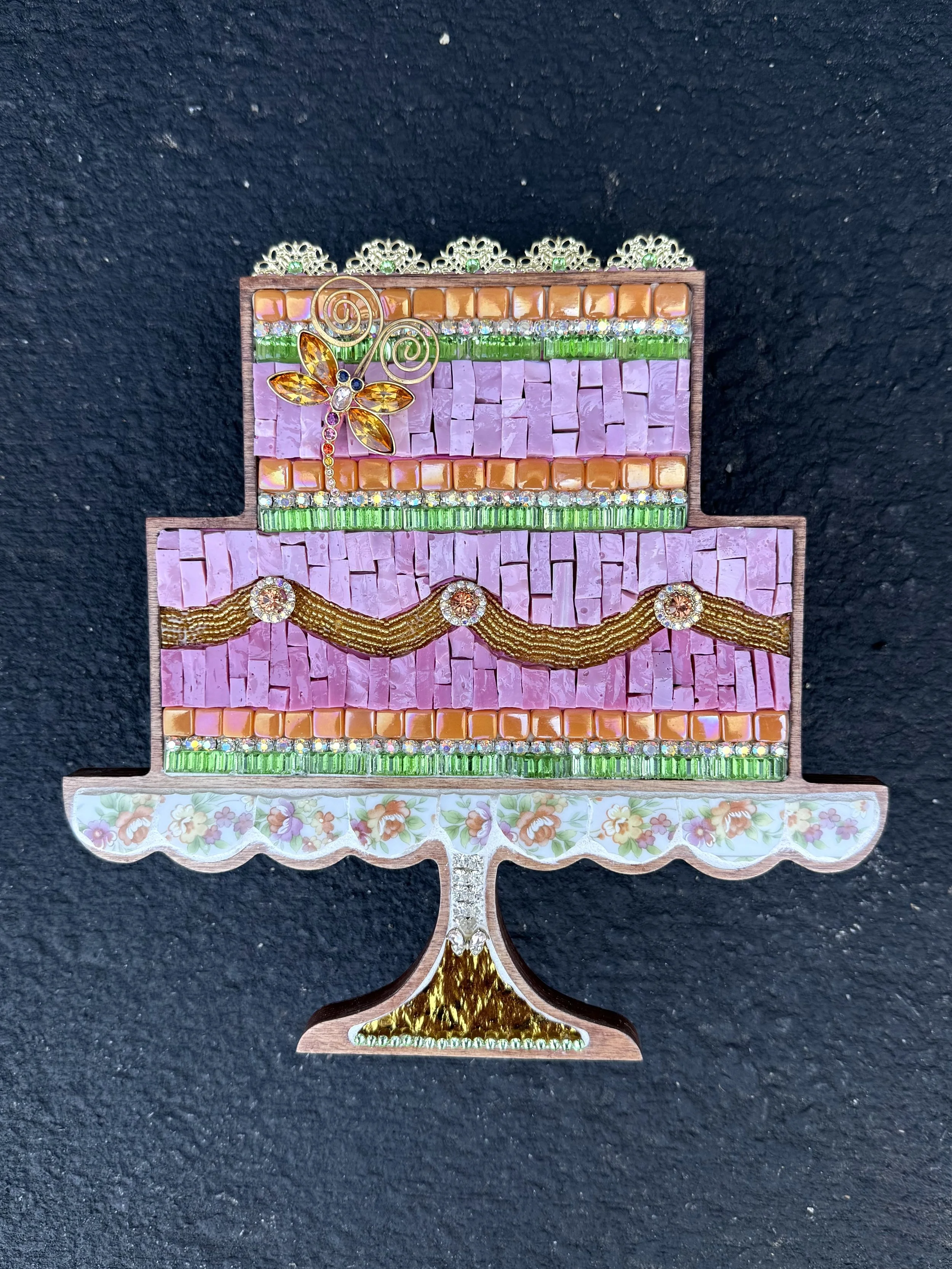 While I was working on these swans swans, I was staring at the cake form and thinking “what am I going to do with this?” The seed pearl beading is a bit wonky but otherwise I am pleased with it. Form purchased from Sharra Frank Mosaics.