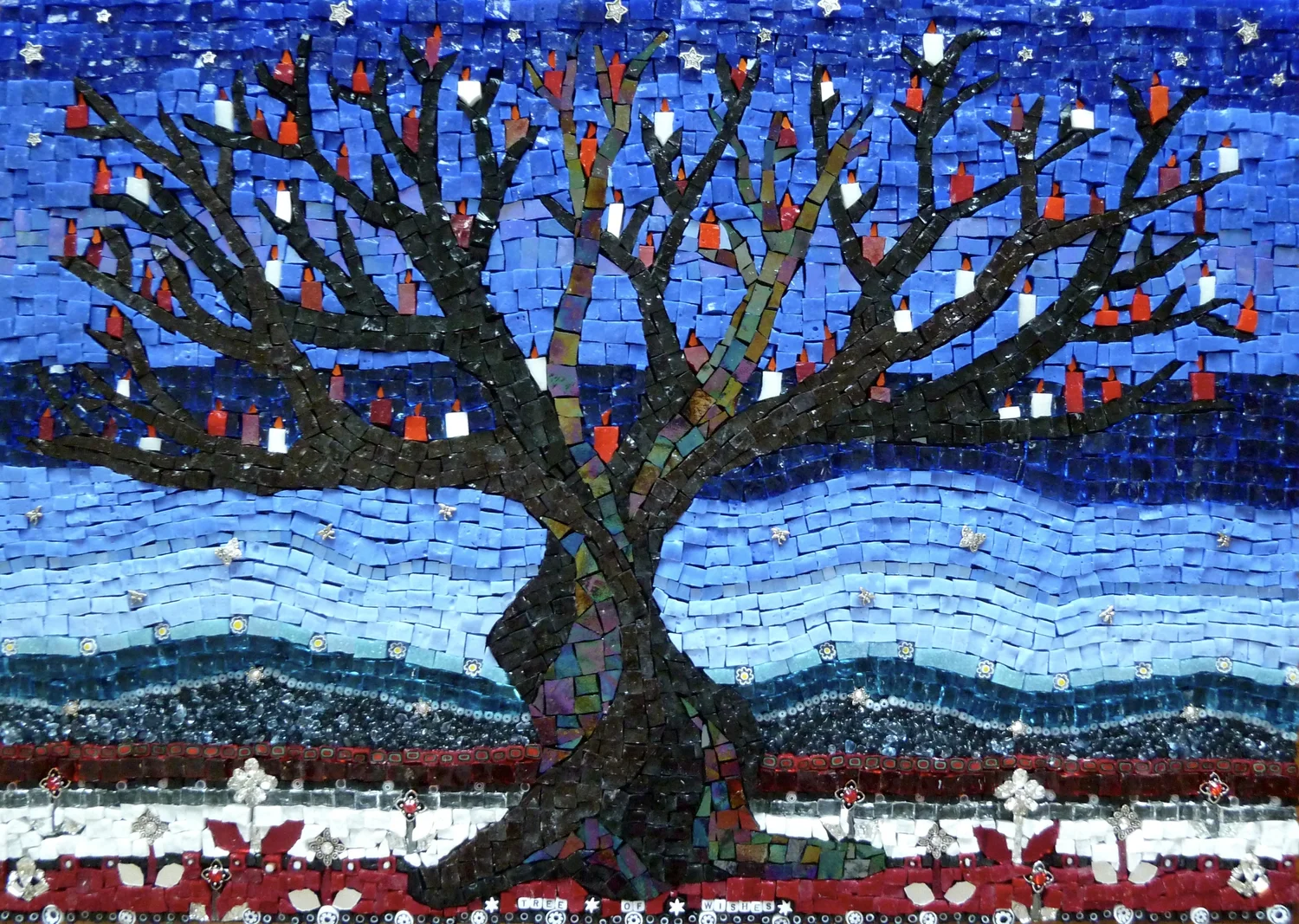 I built this piece around the reindeer on the left created by Michele Lynche. Made os smalti and fused glass.